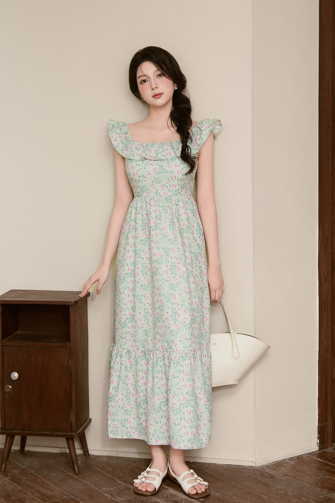 Celine Ruffle Square Neck Maxi Dress - Green Floral [XS/S/M/L/XL/XXL]